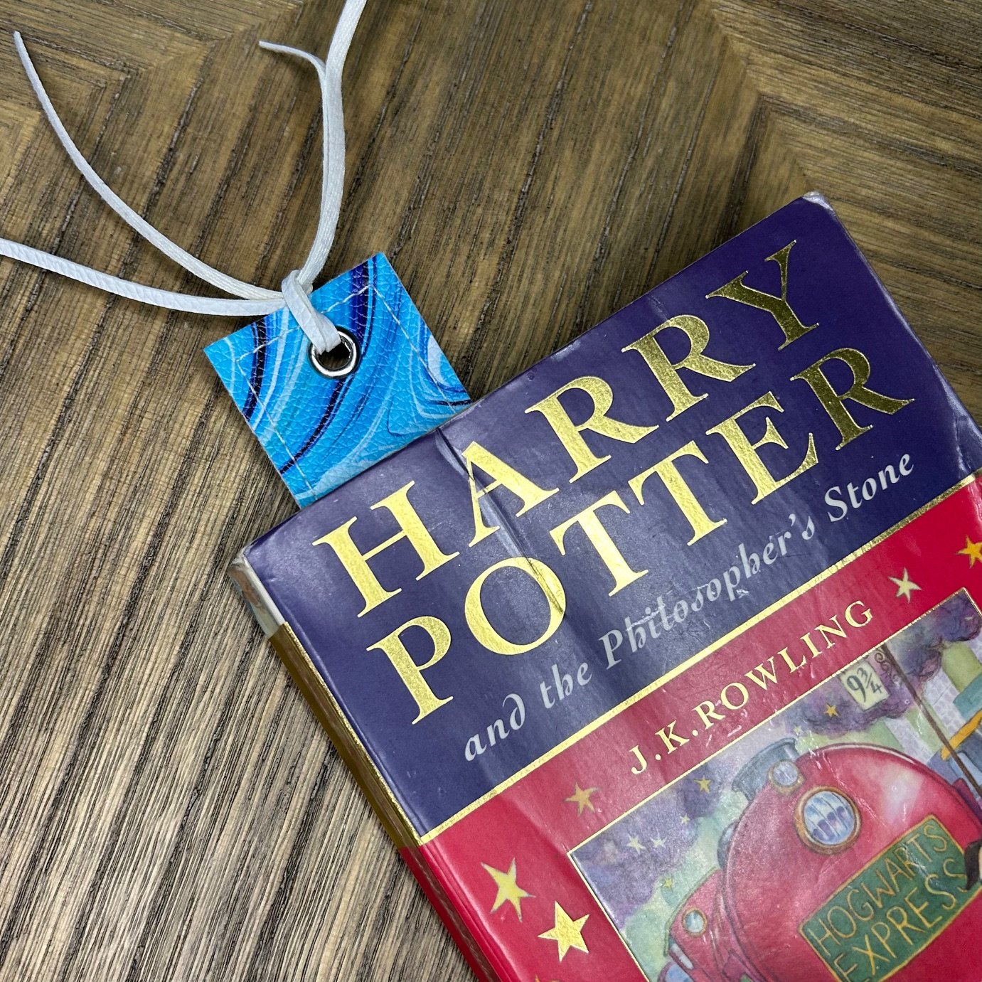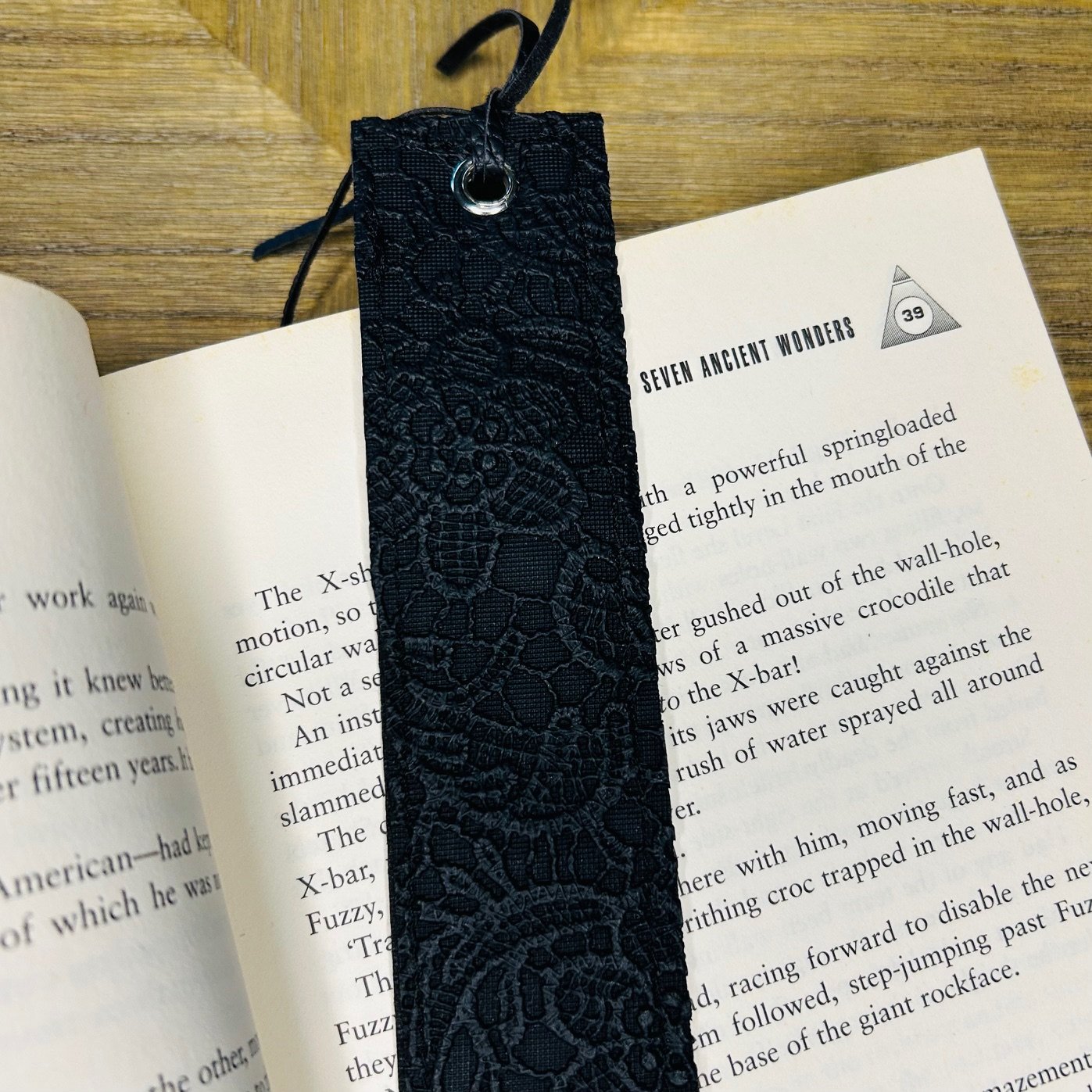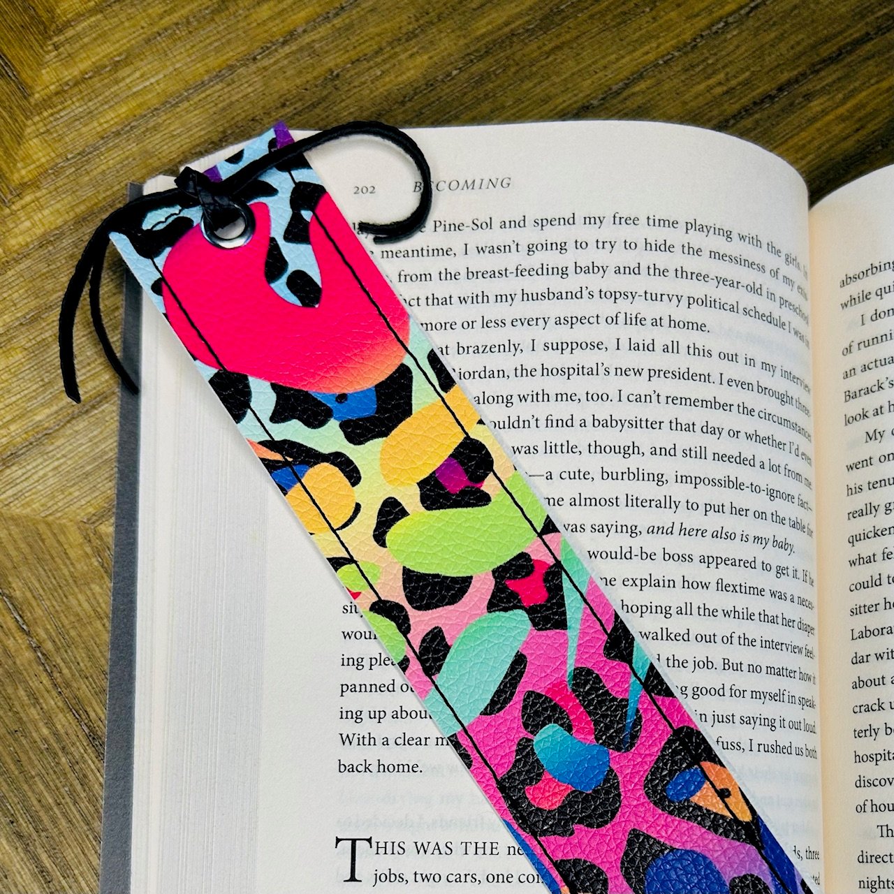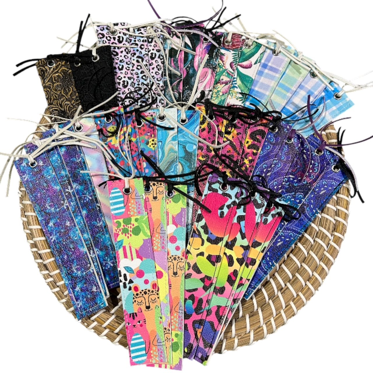 Bookmarks are made from synthetic leather and have a small eyelet in the top with some thin decorative pieces of solid coloured synthetic leather threaded through.