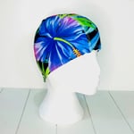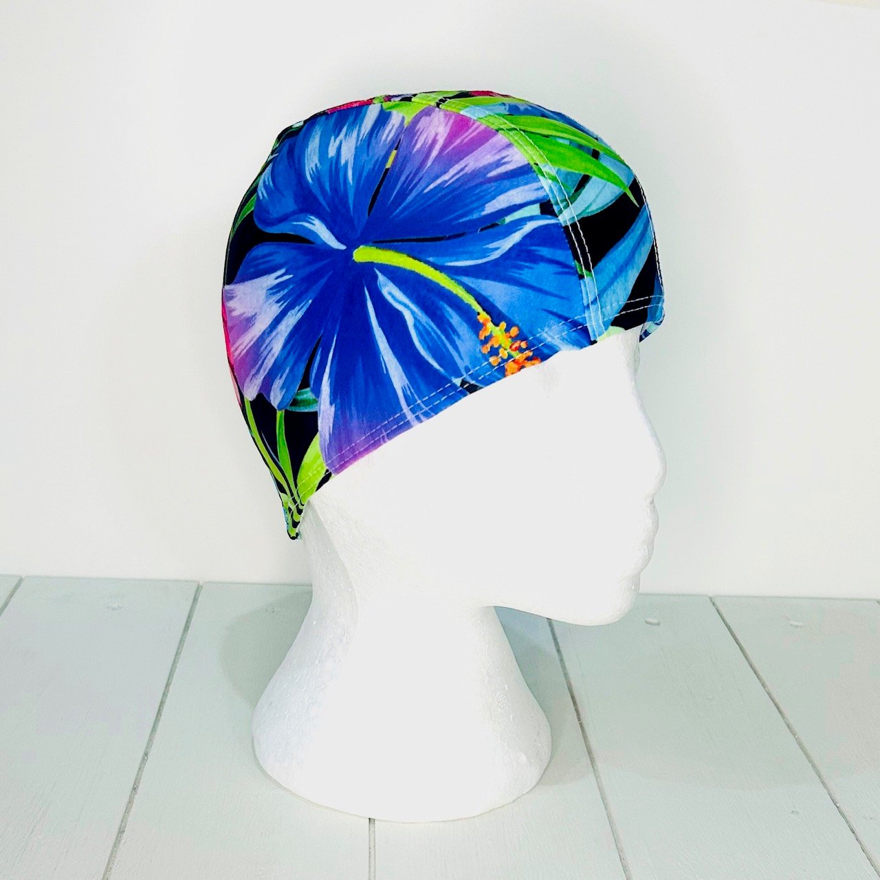 We have a small number of swim caps listed here that can be ready within 48 hours (already cut and ready to sew up). Only sizes small and medium left. You can however order a custom cap and choose fabric from our swim fabric album on facebook. This album has prints and solid rib swim fabrics to choose from. To see our fabric choices click here